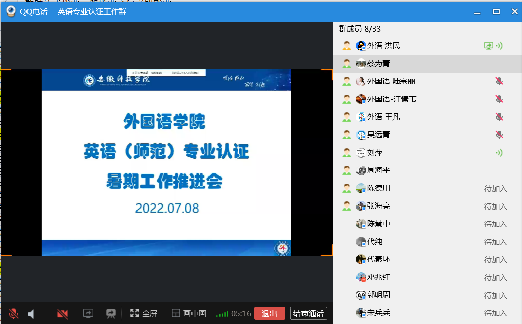 为了推动英语(师范)专业认证工作的顺利进行,7月8日晚,外国语学院通过QQ群在线上召开了暑期第一次组长推进会,学院党政领导及各小组组长参会,会议由刘萍副院长主持。