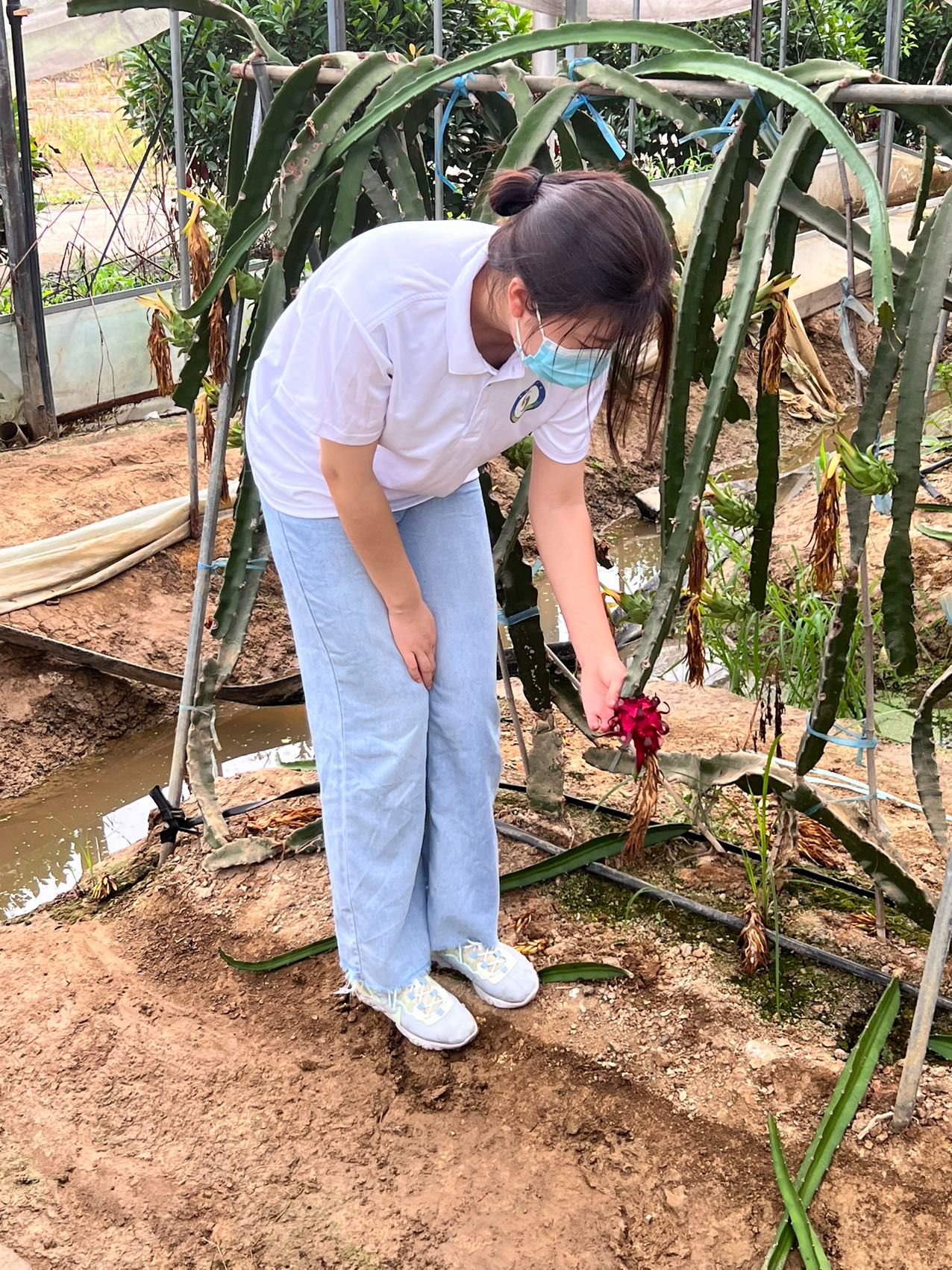 饮水思源,同学们品尝的水果从何而来,又能为水果产业做些什么?带着问题,“裁雨留虹”团队成员于上午9点成功抵达绿勤农业展开调查。队员们首先被一团团似“火球”的红心火龙果吸引住了。