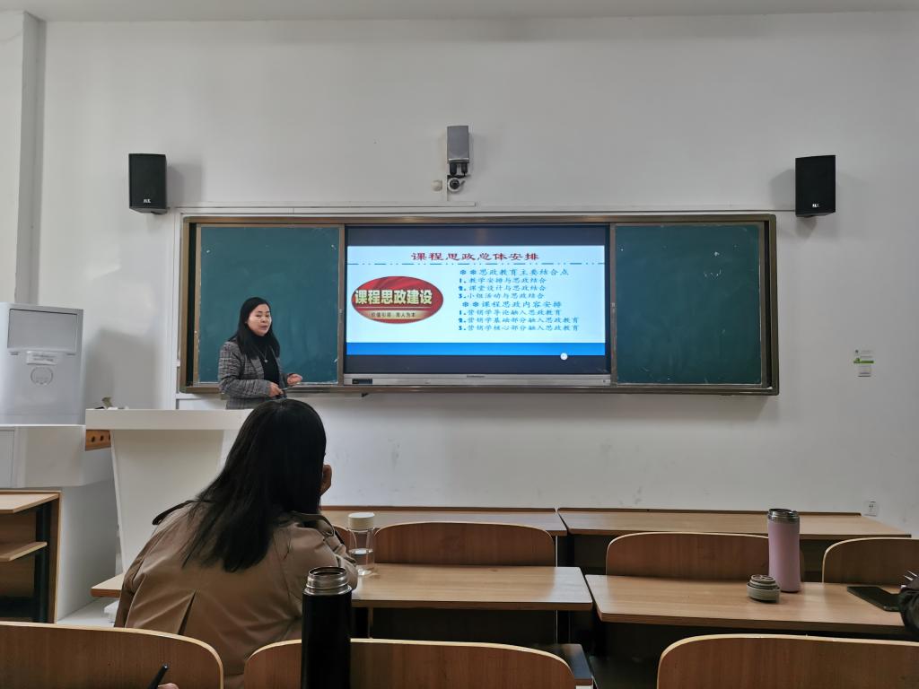 王崇彩老师从课程思政目标、课程思政总体安排、课程思政章节分享三个方面进行汇报。在课程思政目标方面,以践行社会主义核心价值观为根本,以课堂教学为载体,点燃学生内在的动力系统,引导学生树立为中华民族伟大复兴而奋斗的崇高使命。在课程思政总体安排方面,以思政教育主要结合点,将教学安排、课堂设计、小组活动与思政结合,在课程思政内容安排中,将营销学导论、营销学基础部分、营销学核心部分融入思政教育。在课程思政章节分享方面,对各章节课程内容细化,与思政教育一一对应。