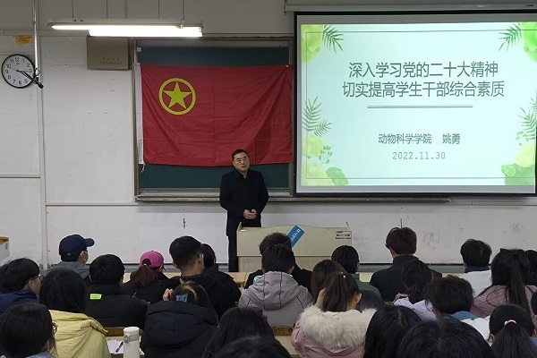 为深入学习贯彻党的二十大精神和习近平总书记关于青年工作的重要论述,引导广大学生骨干增强政治素质、坚定理想信念、提高政策理论水平、优化能力结构,11月30日下午,动物科学学院2022-2023学年团校暨学生干部培训班隆重开班,动物科学学院党委书记姚勇应邀给培训班学员授课,来自学院74名学生干部参加培训。