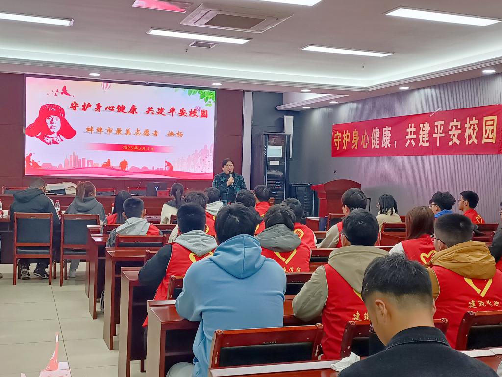 在第60个“学雷锋纪念日”到来前夕,3月4日下午,建筑学院开展“弘扬雷锋精神 践行志愿服务”主题教育,蚌埠市第一人民医院团委副书记、徐杨学雷锋志愿者服务队队长徐杨应邀主讲。蚌埠市第一人民医院内科团支部书记张淑敏、护士姚影,建筑学院党委副书记谢宜勤、团委副书记阮怀思,辅导员王明哲等陪同参加,建筑学院青年志愿者协会成员、青马学员、学生党员、篮球队队员及各班级班长、团支书等百余人参加。活动由建筑学院团委书记沈德艳主持。