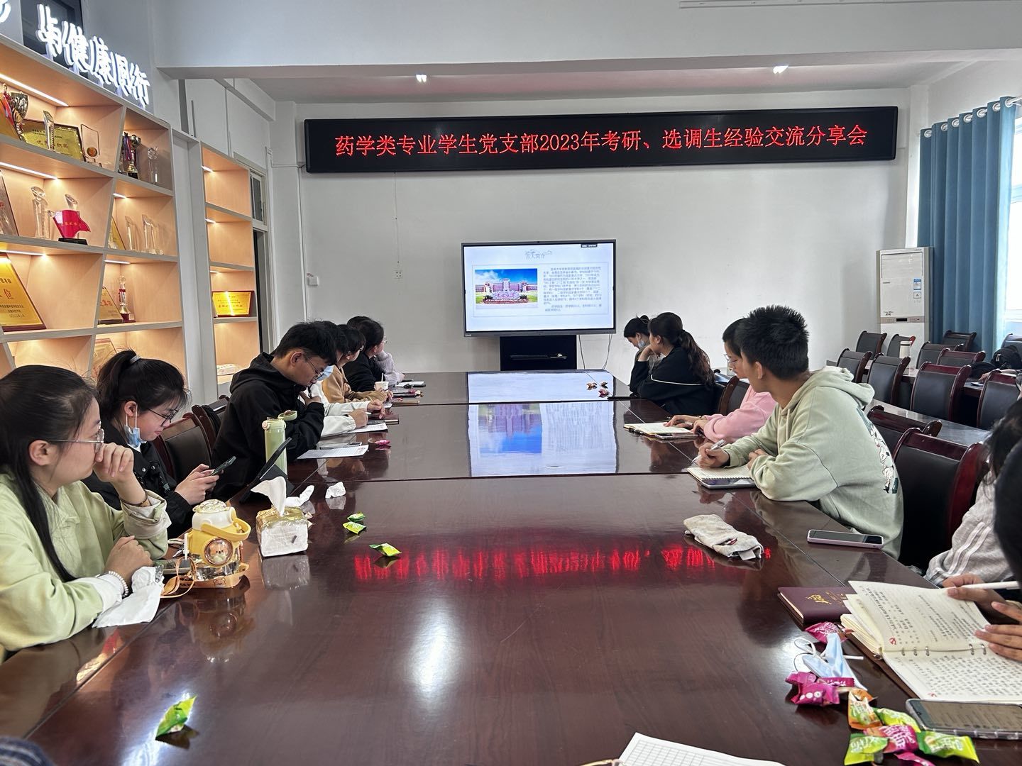 紧张激烈的拔河活动结束后,全体党员前往学院会议室开展2023年考研、选调生经验交流分享会。由党支部四名拟录取硕士研究生和三名拟录取选调生党员做经验分享。学生党员何雨婷、黄雨晨、姚侠、张春伟在2023年硕士研究生考试中分别考取吉林大学药学专业、天津中医药大学中药学专业、杭州师范大学药学专业、安徽医科大学中药学专业,会上他们从备考过程中的院校选择、学习方法、复试注意事项等热点问题做详细讲解。对于首次开展的选调生考试经验交流会,学生党员史玉军、韦欣然、陈大千禧仔细为大家介绍了备考资料的选择、笔试面试经验等内容。