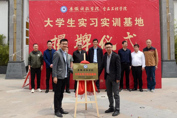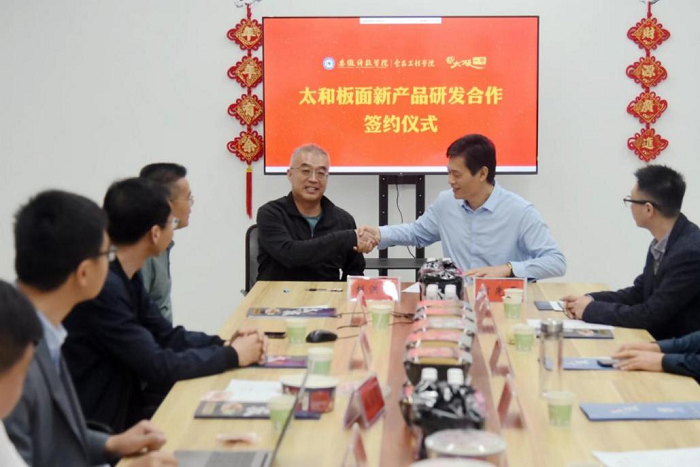 在安徽太板一号食品科技有限公司,付光玺一行与公司董事长胡洪彬、总经理魏继棠深入探讨合作机制。胡洪彬介绍了公司的发展历程、公司研发的太和板面系列产品,并就速食板面加工过程中遇到的技术难题与参会专家进行了深入的探讨。最后双方在太和板面功能性成分分析、板面调料包防腐保鲜、制定速食板面的行业标准等方面达成合作,现场签订了太和板面新产品研发合作协议,举行了WG官方网站食品工程学院大学生实习实训基地揭牌仪式。