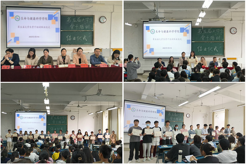 在学院的高度重视、全体学员的共同努力下,为期一学年的第五届大学生骨干培训圆满结束。5月10日中午,生命与健康科学学院在新知楼B304教室举办第五届大学生骨干培训结业仪式。学院党委副书记、纪委书记彭丽萍,辅导员、组织员邓艳萍,团委副书记姜毅,辅导员刘国祥、孙玉楼、张迪、沈靓受邀出席,22级各班班委、学生会工作人员参加此次会议。