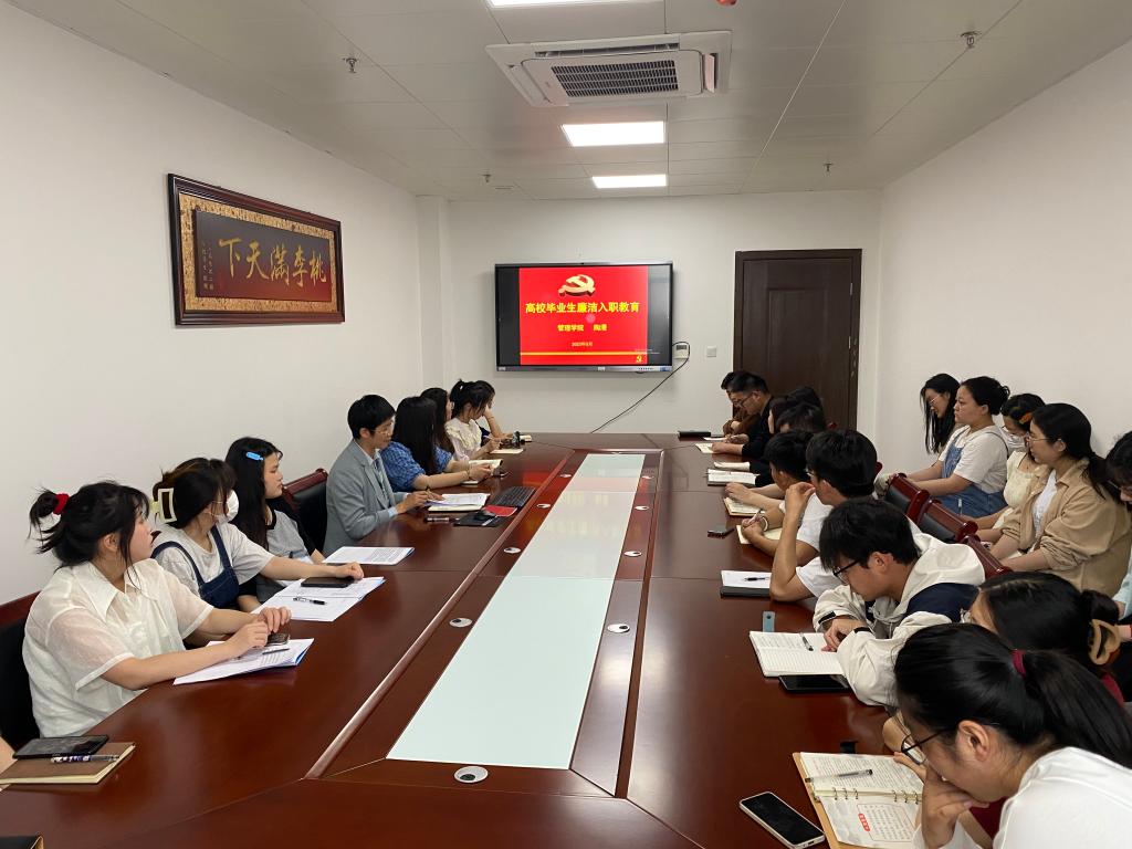 百年大计教育为本,育人之基清廉为要。与会同学纷纷表示要在今后的工作岗位上,严以修身、廉洁从业,牢记母校的嘱托,把责任扛在肩上、把纪律刻在心中,做一个廉洁、勤勉、诚信、实干之人。管理学院历来重视廉洁教育,将其作为学院弘扬新时代廉洁文化、加强廉洁文化建设的重要抓手。此次毕业生廉洁入职教育有助于引导学院青年学子进一步筑牢信仰之基、补足精神之钙、把稳思想之舵,为青年学子走出校园、迈向社会系好人生廉洁诚信、求思进取的第一粒扣子。(特约通讯员:李永鹏 摄影:赵晨妍 审核:陶漫 编辑:张威)