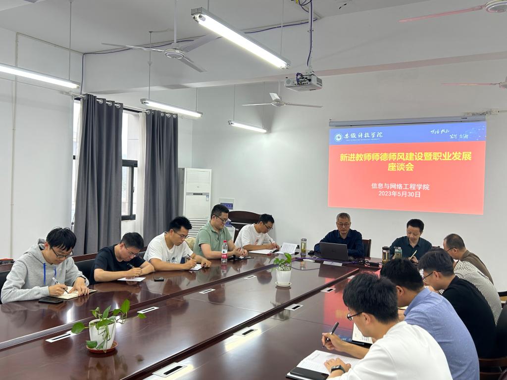 为深入学习贯彻习近平新时代中国特色社会主义思想,进一步加强青年教师队伍建设,5月30日下午,信息与网络工程学院在尚行楼B418会议室召开新进教师师德师风建设暨职业发展座谈会,学院党委书记王振其、院长余宏杰、副院长何恩节、副院长曹浩及全体新进青年教师参加了会议,会议由王振其主持。