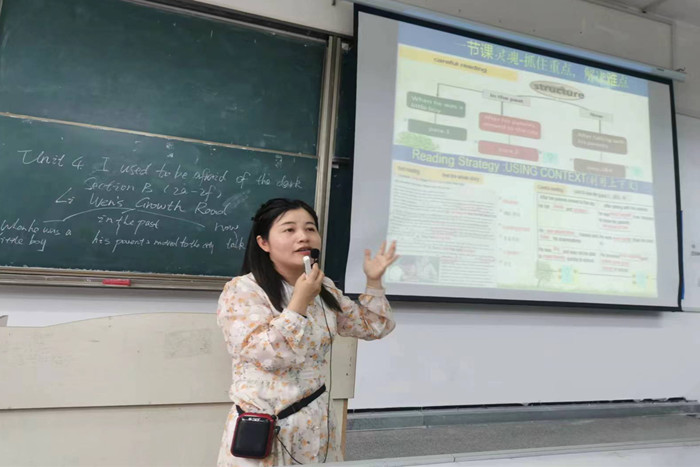 黄倩倩老师展示了一堂题为《I used to be afraid of the dark》的英语阅读课。黄老师以阅读文本为载体,精心设计问题,以问题为导向,由浅入深,层层递进,引领课堂;以小组合作的形式,让学生积极思考、推理和探究,既训练学生的语言思维,又提升学生的合作学习能力和语言能力。示范课结束后,黄老师又细致地解读了新课标引领下育人方式的变革,从备课、课程标准、育人价值等方面指出“精神引领”和“习惯塑造”的重要性,并特别强调将教材教活,让教学走进现实生活的意义。最后,黄老师希望同学们能够多一点耐心、多一点思考、多一点细致,在教学中抓住重点,解决难点,进而促进实践教学。