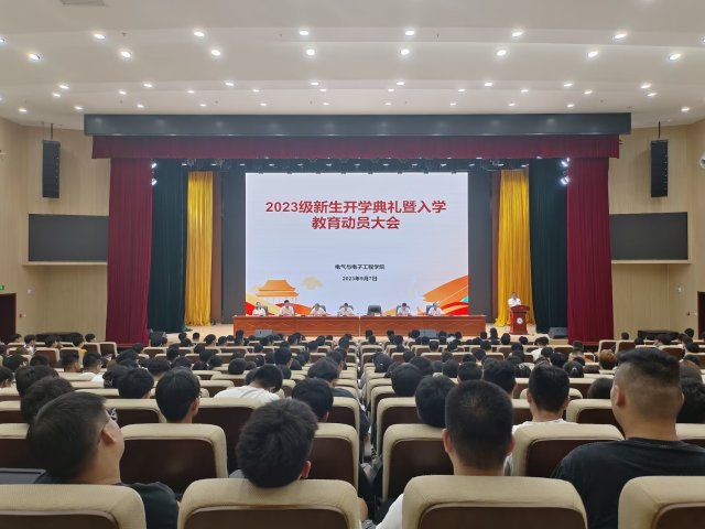 9月7日下午,电气与电子工程学院于东辅楼二楼报告厅隆重举行2023级新生开学典礼暨新生入学教育动员大会。学院党委书记骆海邦,党委副书记、院长夏显明,党委副书记、纪委书记尚磊,党委委员、副院长国海、樊晓宇,党委委员李双喜出席本次会议,各系主要负责人、教学秘书、全体辅导员及2023级新生参加此次会议。会议由骆海邦主持。