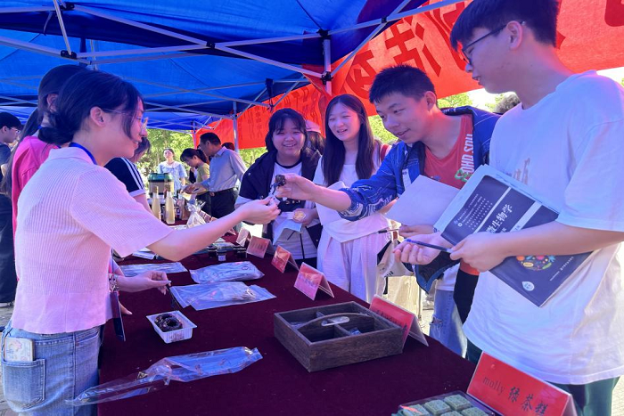 活动现场,琳琅满目的美食展位成为了一道亮丽的风景线,学院各学科团队创作的各类产品让人目不暇接。酵母富硒-降糖咀嚼片、果蔬酵素、菊花饼等产品口感独特、包装新颖,充分展示了食院学子对专业的思考和热爱。师生们在现场不仅能够尽情品味,还能通过易班平台互动答题,在趣味互动中提高对美食文化的理解。特别引人注目的是,现场还设立了茶文化展示平台,将茶艺表演与多元艺术形式相结合,“茶艺师”举手投足之间,将茶文化的美妙展现得淋漓尽致。“这个好吃包装又好看,我要打满分!”现场师生拿着评分表,当起了大众评委,一边细细品尝一边认真打分。