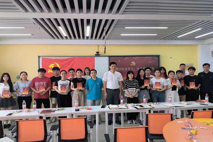 活动中,全体党员观看了党课视频《献给毕业生:愿你们廉洁从业,逐梦山海》,进一步坚定了初心使命,凝聚了奋进力量。视频结束后,参会教师党员为毕业生党员和新发展党员佩戴了党员徽章,党委委员分批向毕业生党员和新发展党员颁发了“政治生日”卡。在现场,党员代表阮芹悦和王春悦用歌声传递了对毕业生党员的深深祝福,表达了对毕业生党员的美好祝愿和期许。新发展党员向毕业生党员赠送了纪念贺卡,用文字传递了他们对学长学姐们的敬意和感激。在欢声笑语中,付光玺切下了一块块蛋糕,送给了毕业生党员。可口的蛋糕,也在传递着学院对毕业生们未来“如鱼得水,胜蜜糖甜”的殷殷祝福。全体党员也在付光玺的带领下庄严肃穆的重温入党誓词活动,使现场的每一位党员都再次接受了心灵的洗礼,产生了强烈的共鸣,加强了全体党员的党性修养。
