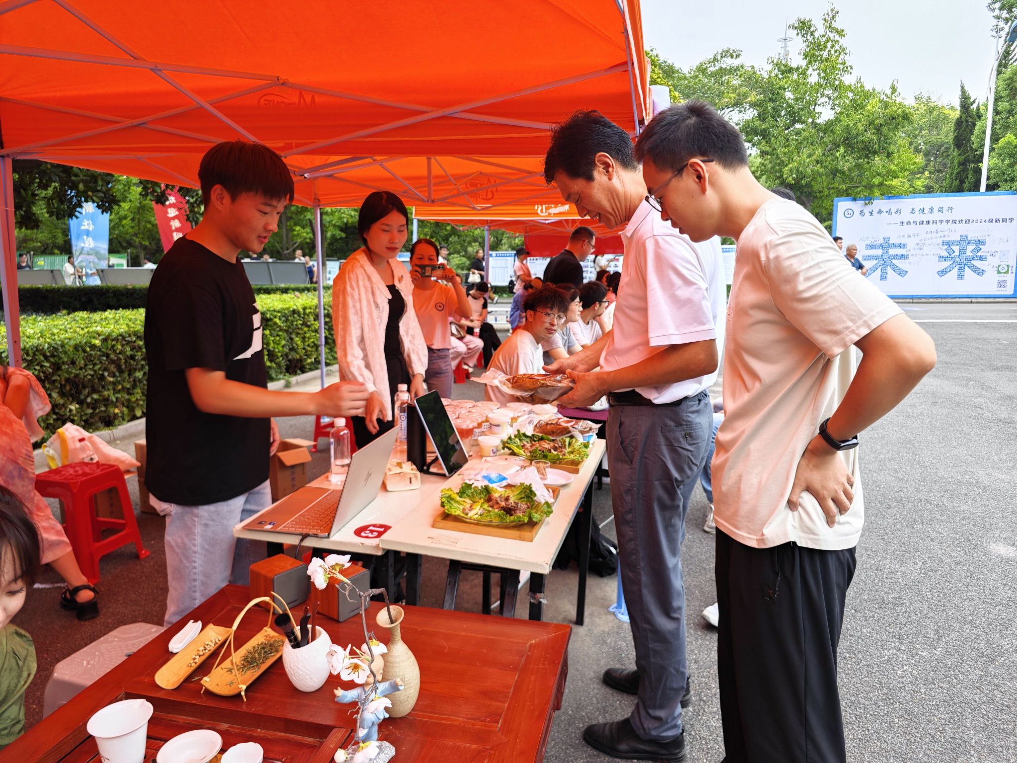学院报到点经过精心布置,迎新报到服务区、特色食品展示区、茶艺表演展示区布局有序,学院简介、科学研究、社会服务、人才培养、学院“六星”“十佳”大学生风采展示录等沿诗琴湖畔一字排开,充分展示了学院的文化底蕴和学科特色,也将迎新现场打造成了食品文化育人的重要阵地。