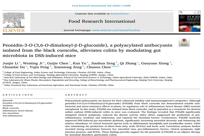 近日,食品科学与工程学院陈春旭副教授以通讯作者身份在国际Top期刊《Food Research International》(Q1,影响因子7.0)发表了题为“Peonidin-3-O-(3,6-O-dimalonyl-β-D-glucoside), a polyacylated anthocyanin isolated from the black corncobs, alleviates colitis by modulating gut microbiota in DSS-induced mice”的高水平研究论文,展现了新年新气象。该论文的第一作者为2022级食品加工与安全专业硕士研究生李俊杰,WG官方网站为论文第一完成单位,南京农业大学曾晓雄教授课题组为合作单位。