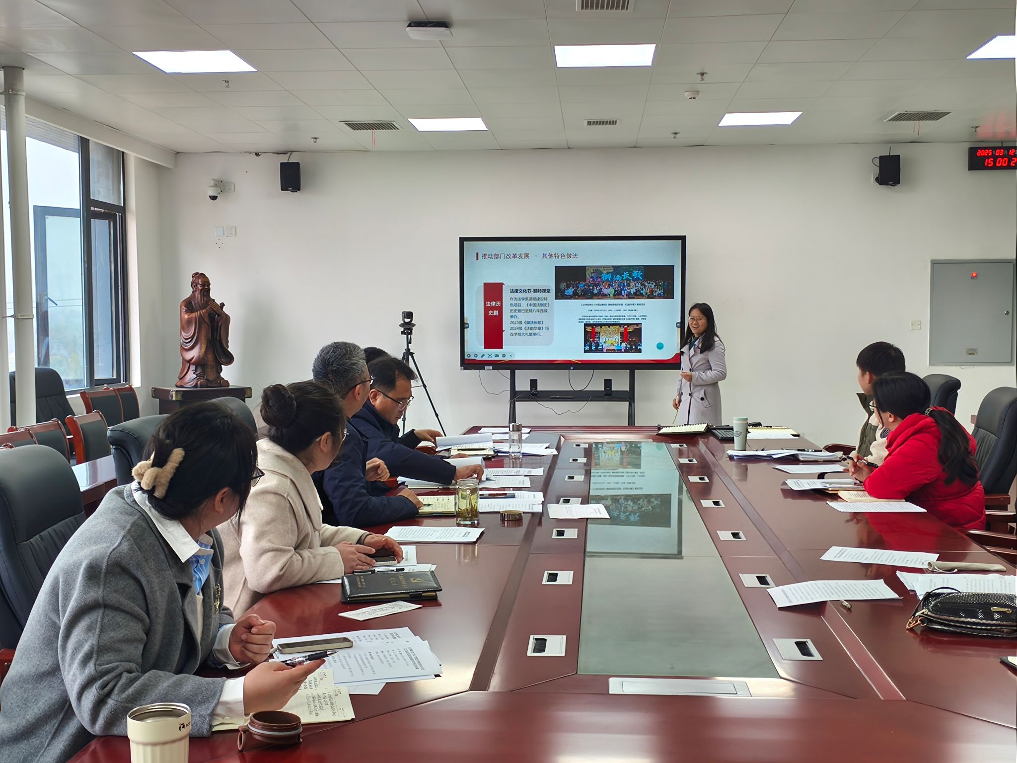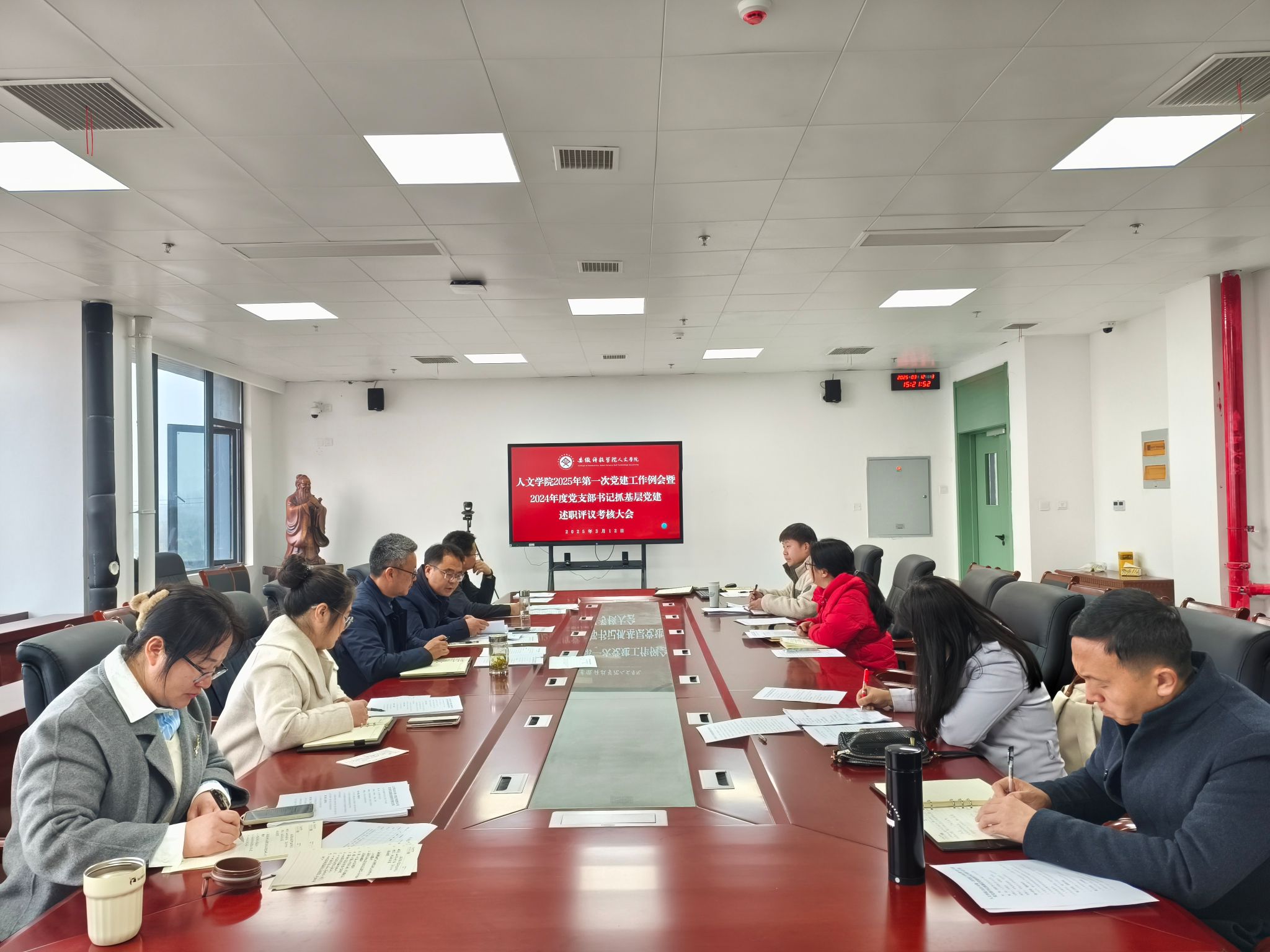 为切实履行管党治党政治责任,全面落实新时代党的建设总要求,推动全面从严治党向基层延伸,3月12日下午,人文学院在学院会议室召开2025年第一次党建工作例会暨2024年度党支部书记抓基层党建述职评议考核大会,总结2024年党建工作成绩,梳理存在问题和困难,研讨部署2025年党建工作重点任务。学院党政领导班子成员、党委委员、全体党支部书记及党政办公室、团委负责同志参加会议。会议由学院党委副书记李晓东主持。