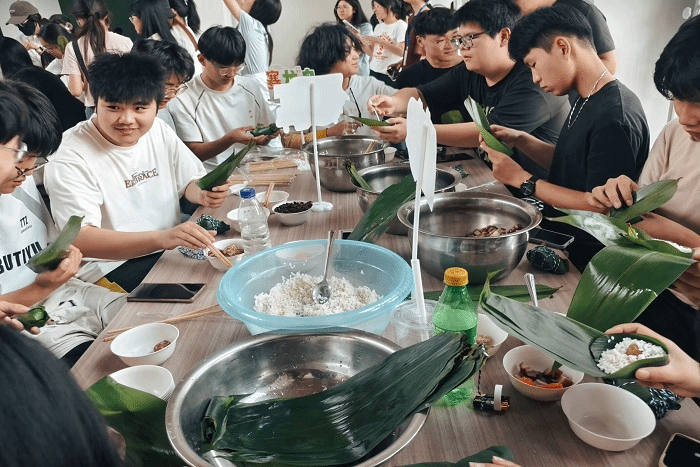 学院特别准备了新鲜的粽叶、糯米、红枣、豆沙等丰富食材。在“包粽达人”学姐的悉心指导下,同学们纷纷化身“巧手匠人”,捋叶、填米、加料、压实、裹叶、扎绳……动作从生疏到逐渐娴熟。一片片青翠的粽叶在指尖翻飞,一粒粒晶莹的糯米包裹着甜蜜的馅料,更包裹着同学们对传统文化的感悟和对美好生活的期许。“没想到包粽子这么有趣,看着自己包的粽子虽然形状各异,但成就感满满!这可比课本上学食品工艺生动多了!”一位正在努力“造型”的大一同学兴奋地说。现场粽香四溢,其乐融融,充满了劳动的喜悦与节日的温馨。