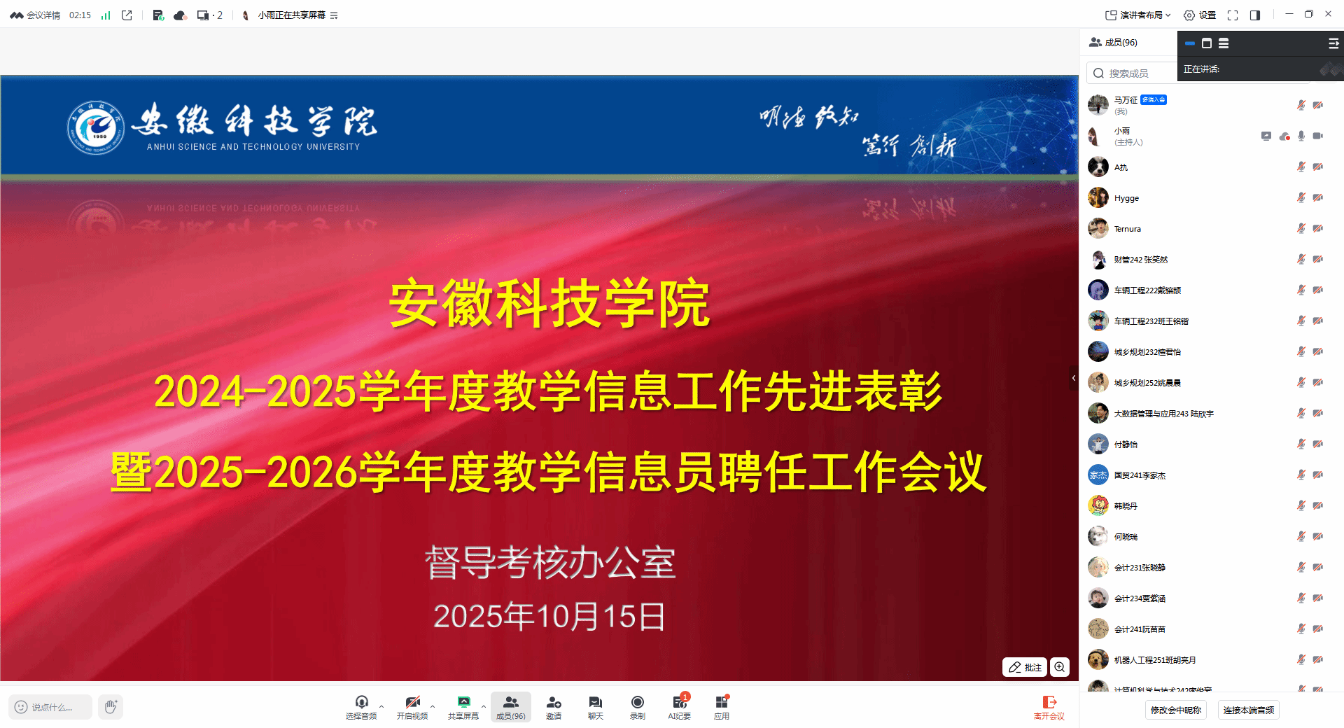 10月15日下午,督导考核办公室在学知楼402组织召开2025-2026学年度学生教学信息员工作会议,旨在表彰2024-2025学年度教学信息工作先进,并宣布聘任2025-2026学年度学生教学信息员的决定。督导考核办公室工作人员出席会议,各教学院(部)教学信息员代表参加会议。会议由督导考核办公室孙安弟主持。