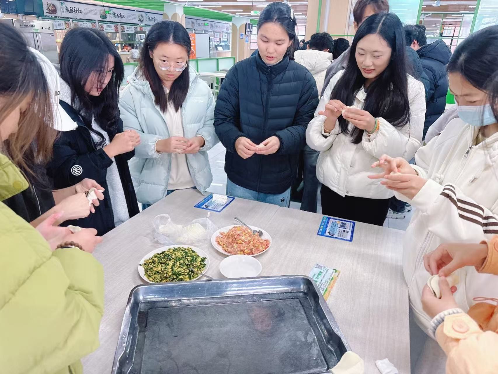 活动现场布置的温馨有序,暖意融融,洋溢着浓厚的节日氛围。同学们踊跃参与,围坐在一起,在食堂阿姨的安排下,迅速分成若干小组,分工协作、密切配合。拌馅、擀皮、捏合,一系列动作娴熟流畅,形态各异的饺子在大家手中陆续成型,同学们包出的饺子形态各异,有月牙形的、元宝型的,还有的别出心裁地捏出了各种小动物的造型,每一个看似不太规范的饺子却包裹着同学们的专注与情谊。在包饺子过程中,大家相互交流技巧、分享经验,不仅传承了传统手艺,更增进了彼此间的沟通与协作,充分展现了安科学子团结友善的精神风貌。