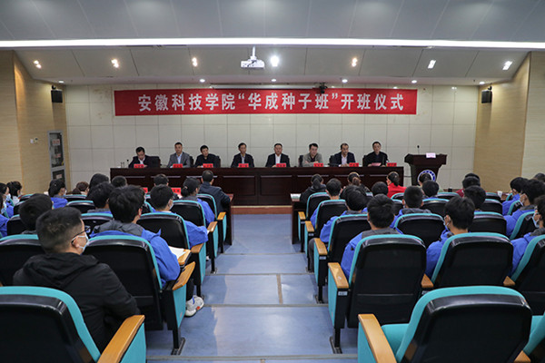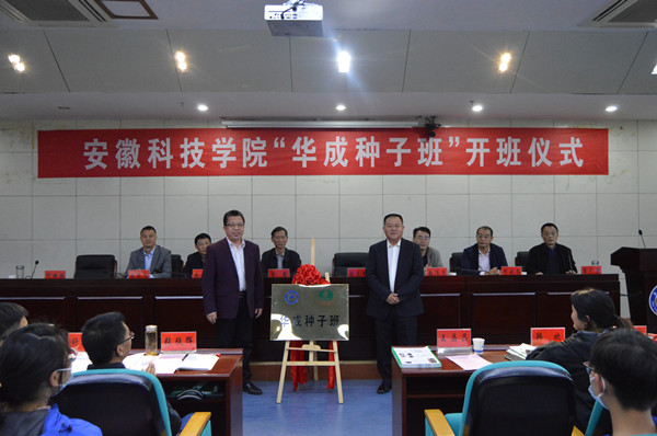 开班仪式上,何世潮代表农学院发言。何世潮以“机会”为关键词,表达了感谢、希望和承诺,鼓励同学们努力学习,立志成才,做出贡献,争做让社会认同、让学校骄傲的农学人、安科人。舒英杰介绍了“华成种子班”组建情况,并宣读了农学院关于组建“华成种子班”的决定。刘良柏和何世潮共同为“华成种子班”揭牌。李文阳代表学院和华成种业向“华成种子班”授旗。“华成种子班”学生代表许诺作表态发言。