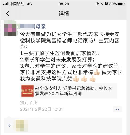 本次“云家访”活动,使学校、学院在寒假疫情期间及时了解学生的实际情况,掌握学生思想动态、实际困难与需求,传递了温暖、关怀,增进了学校与家庭、辅导员与家长的联系,增强了家校协同育人的信心,形成学校、家庭、社会的教育合力,促进学生健康成长和全面发展。同时也进一步推动了疫情防控工作,保障了广大学生寒假期间的生命健康安全。(特约通讯员:焦雪松 审核:李沙娜)