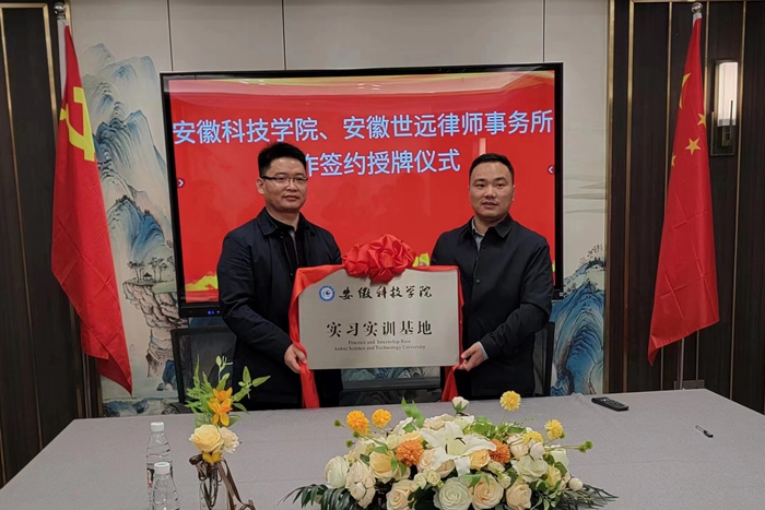 李晓东代表学院与安徽世远律师事务签署实习实训基地协议,牛永辉向安徽世远律师事务所授予“WG官方网站实习实训基地”牌匾。(特约通讯员:高晓宁 摄影:高晓宁 审核:牛永辉)