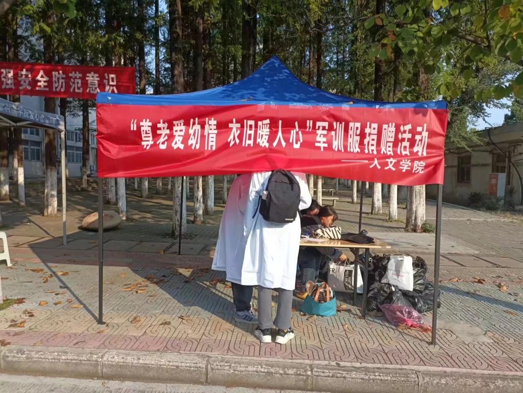 为促进青年志愿活动,体现人文关怀,共建先进有爱校园,11月5日,人文学院青年志愿者协会以“奉献、友爱、互助、进步”的志愿者精神为指导,开展“尊老爱幼情,衣旧暖人心”军训服装捐赠活动。
