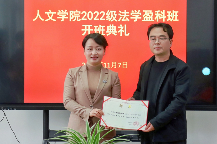 11月7号下午,人文学院2022级法学“盈科班”开班典礼在学知楼324室成功举行。出席开班典礼的有北京盈科(蚌埠)律师事务所管理委员会主任张丽、执业纪律委员会主任李德、青工委主任朱晓磊、人才战略委主任孔繁昌、执行主任王旻;人文学院党委书记杜士凤、副院长李晓东、副院长牛永辉、党委副书记李沙娜、法学系主任张晓云、“盈科班”辅导员鲁冰冰以及“盈科班”全体同学。开班典礼由杜士凤主持。