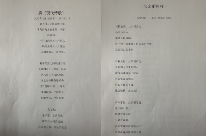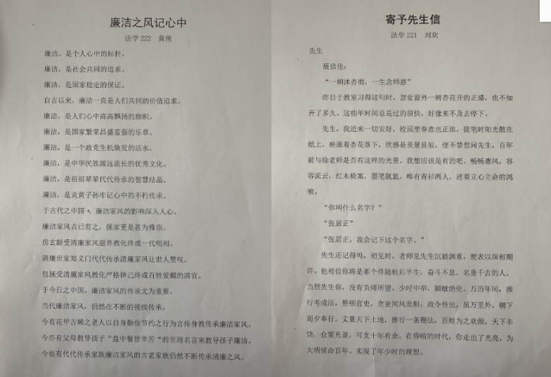 此次廉洁征文作品形式多样,同学们积极参与,许多优秀作品涌现其中。其中王家喜的现代诗歌《廉》用词优美布满灵气,以“我”为角度用宏大的想象构筑笔下的世界,隐含对廉洁的坚定追求;刘欢的《寄予先生信》以书信形式与廉洁代表人物张居正对话,其颁布有利于天下子民的政令流芳百世,是对为官清廉大公无私的肯定;王荟权的现代诗歌《父亲的模样》,则是从最贴近身边的“父亲”这一形象描写清廉,由普通人的清廉体现清廉的伟大,渺小却又不平凡。此外,王尹的《对廉政文化进校园和大学生廉洁教育的思考》、陈丽敏的《廉洁不忘初心,勇担时代使命》和黄俊的《廉洁之风记心中》等都是优秀作品。