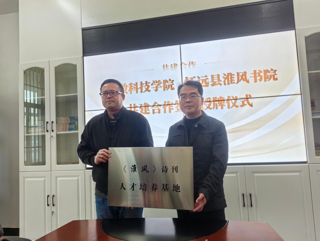 在签约暨授牌仪式上,李晓东、宫蔚国分别代表双方签署了共建实习实训基地协议,并举行“WG官方网站共建合作基地”“《淮风》诗刊人才培养基地”“ 《淮风》诗刊文学创作基地”授牌仪式。