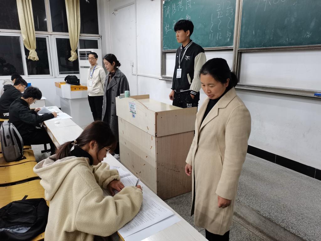 为促进2021级新生深入了解学校的各项规章制度,遵守校规校纪,11月7日晚,生命与健康科学学院在求知楼A栋、共7个教室进行《学生手册》考试,全体2021级新生参加,学院党委副书记彭丽萍、专职辅导员孙玉楼到场巡查。