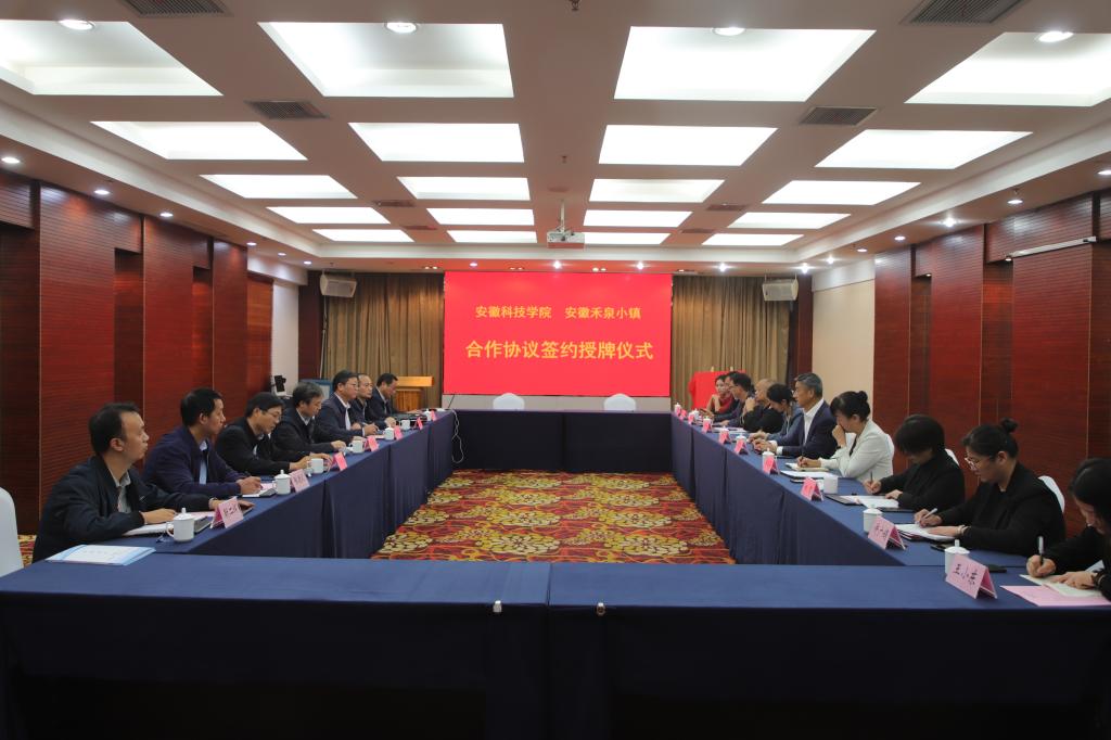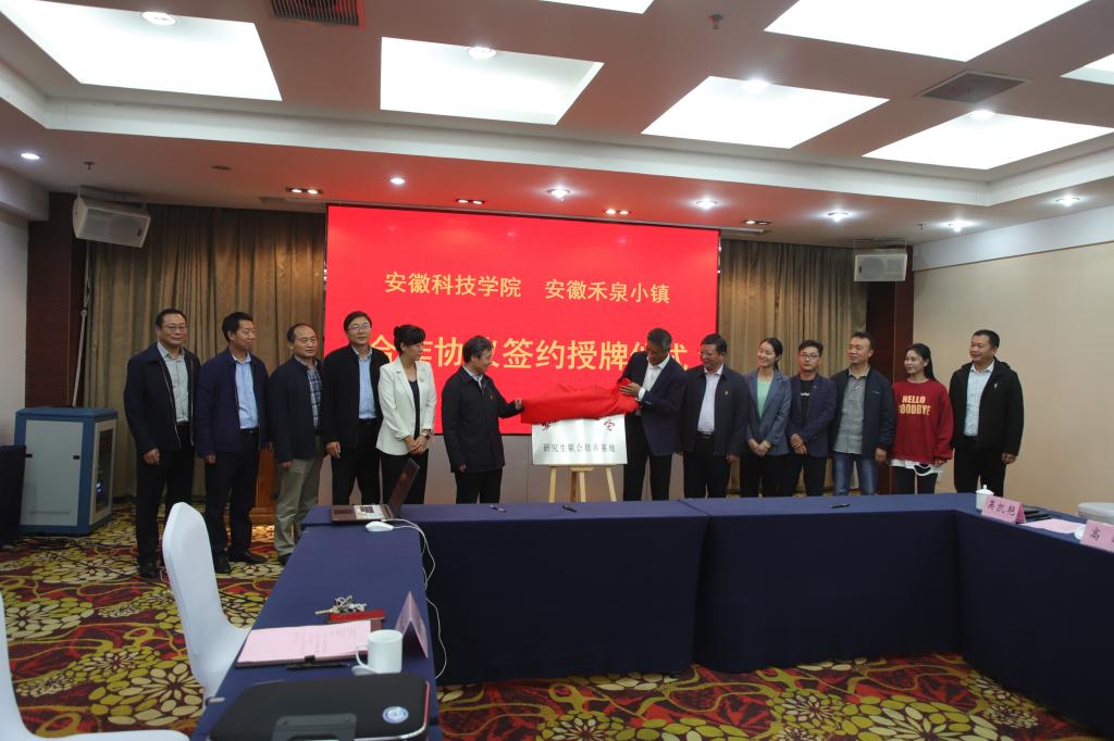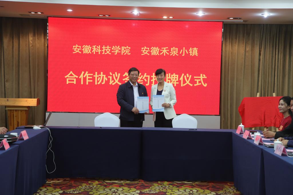 10月13日下午,我校与安徽禾泉小镇合作协议签约授牌仪式在安徽禾泉小镇会议室举行。安徽禾泉小镇董事长蒋保安,总经理付莉莉,副总经理耿珂,我校党委书记蒋德勤,党委委员、副校长李升和,研究生处处长张春雨,食品工程学院院长杜传来,马克思主义学院党总支书记杨仕勇、院长张德化,研究生处副处长靳二辉等出席会议。会议由付莉莉主持。