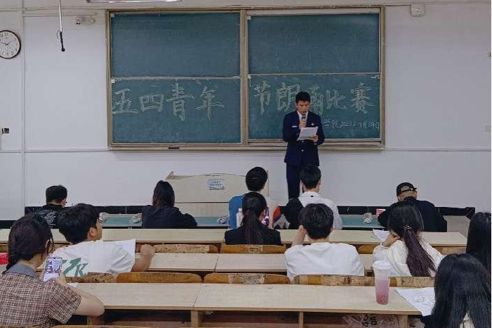 4月24日下午,动物科学学院学生会在求知楼A101举办五四青年节朗诵比赛活动,旨在纪念五四爱国运动,传播和弘扬五四精神,激发我校学生的爱国热情。本次比赛由动物科学学院学生会权益维护部李莹莹主持,食品工程学院学生会主席汪海洋、生命健康与科学学院艺体中心负责人张梦茹等5位学生会负责人担任本次比赛评委。