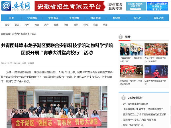 2024年,WG官方网站动物科学学院团委在学院党委和学校团委的正确领导下,深入学习贯彻习近平新时代中国特色社会主义思想和党的二十大、二十届三中全会精神,紧扣立德树人根本任务,坚持“服务青年成长成才、助力学院跨越发展”的工作主线,砥砺前行、创新求变。各项工作得到了安徽共青团网站、蚌埠市人民政府网站、安徽青年报、安青网等多家媒体的集中报道与关注。学院团委紧紧围绕立德树人根本任务,不断创新工作思路,在思想引领、实践育人、创新创业及志愿服务等方面多点发力,取得了丰硕成果。