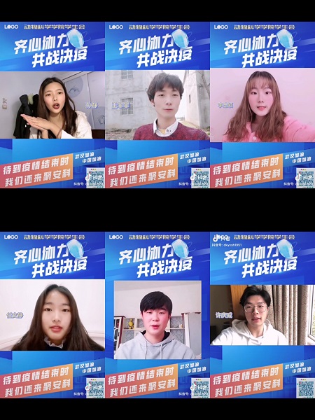 动物科学学院的团员青年们虽然不能奔赴抗“疫”一线,他们也用着自己的方式来为武汉送去一份关怀。一声声加油,坚定有力。一声声加油,充满希望,学子用心声传递温暖,用爱心传递祝福,充分展现动物科学学院广大团员青年在抗“疫”斗争中的精神面貌。(特约通讯员:李焱)
