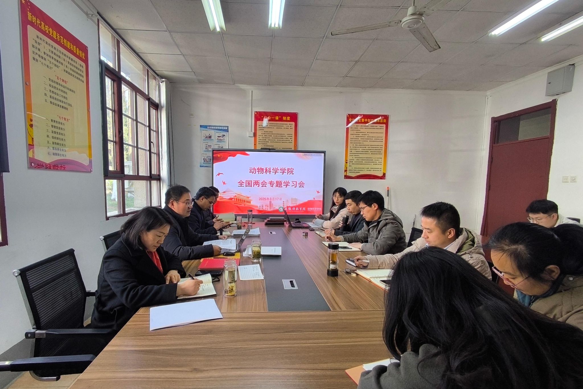 为深入学习贯彻2025年全国两会精神,特别是习近平总书记关于教育、科技、人才的重要论述,3月18日下午,动物科学学院在学院会议室召开全国两会精神专题学习研讨会,会议由党委书记甘宗平主持,学院党委理论学习中心组成员、各党支部书记、系(室)主任参加学习。