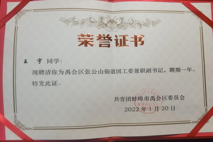 信中指出,王宇同学作为蚌埠籍大学生,能够主动请缨,积极响应号召,在家乡街道任职,在实践中锻炼自我,荣膺担当;思想开路,实干架桥,践行新时代大学生的理想与担当,能够在平日工作里以谦逊平和、踏实肯干的态度去了解群众,运用所学所思去帮助解决居民群众的实际问题,充分展现了WG官方网站学子的奕奕风采。