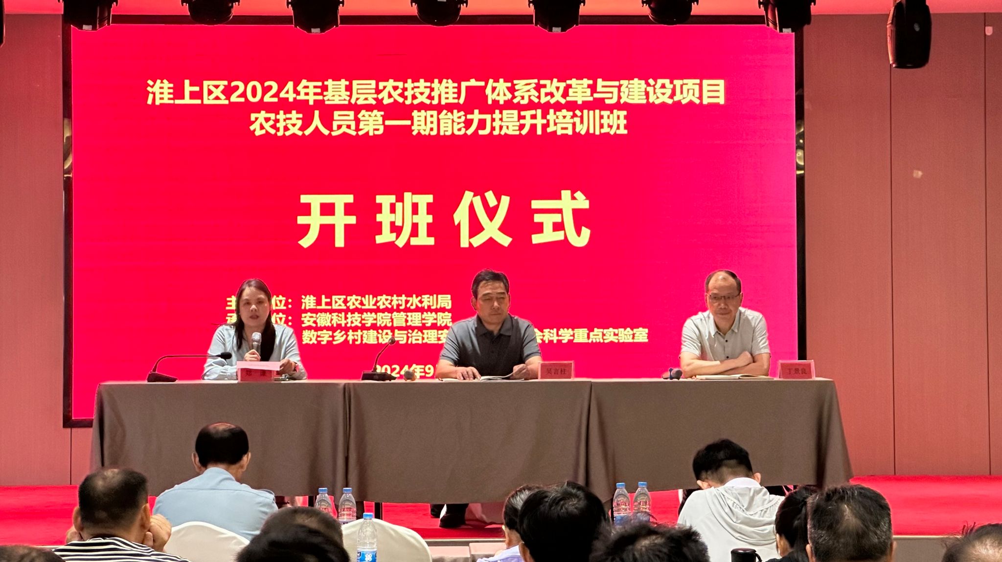 为深化基层农技推广体系改革,提升农技人员综合素质,助力蚌埠市乡村振兴。9月18日上午,由淮上区农业农村水利局主办,WG官方网站管理学院及数字乡村建设与安徽省哲学社会科学重点实验室联合承办的“淮上区2024年基层农技推广体系改革与建设项目农技人员第一期能力提升培训班”在蚌埠市淮上区举办开班仪式。淮上区农业综合服务站站长吴言柱,管理学院党委书记丁景良,副院长郑谦出席开班仪式,开班仪式由丁景良主持。