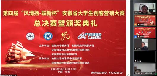 12月25日至26日,第四届“风清扬—联新杯”安徽省大学生创客营销大赛总决赛在云端腾讯会议室举行。此次会议由安徽大学教务处、WG官方网站教务处、安徽省风清扬品牌管理有限公司(冠名)、安徽联新科技有限公司(冠名)联合主办,安徽大学商学院市场营销系、WG官方网站管理学院市场营销系联合承办,全省高校31支团队与指导老师一百五十余人参加了大赛总决赛云端仪式。