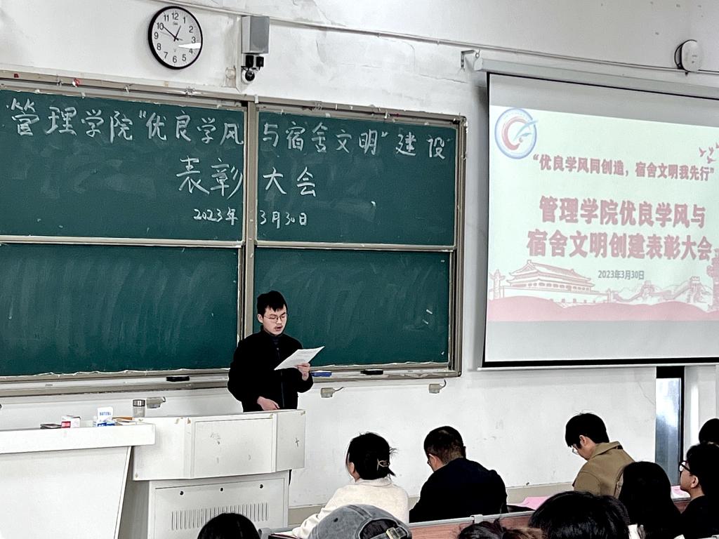 为进一步加强管理学院优良学风与宿舍文明建设,营造优良学风人人受益,文明创建人人有责的良好氛围,3月30日,管理学院在致知楼C111教室召开优良学风与宿舍文明创建表彰大会。管理学院党委副书记陶漫、党政办公室主任李永鹏、专职辅导员姚姝媛和杨小咪出席表彰大会。会议由赵晨妍主持。