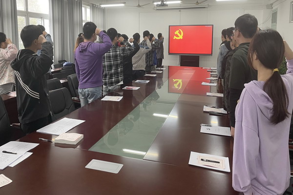 2021年4月12日中午,机械工程学院党委在学院会议室举办新发展党员入党宣誓仪式。仪式由机械工程学院党委副书记张程主持,由辅导员张立亮领誓,参加仪式的学生党支部书记和新发展的29名预备党员右手握拳举过肩头,面向鲜红的党旗,逐句庄严宣誓。