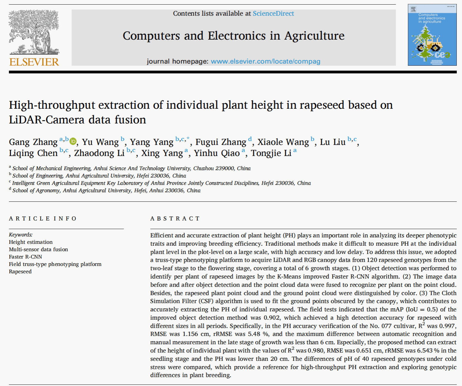 近日,我校智能制造学院张刚教师(第一单位/第一作者)在国际学术期刊《Computers and Electronics in Agriculture》(中科院1区TOP期刊(农林科学),IF:7.367)上发表了题为《High-throughput extraction of individual plant height in rapeseed based on LiDAR-Camera data fusion》的研究论文。该研究提出了一种基于雷达与相机数据融合的高通量油菜个体株高提取方法,实现了从两叶期至开花期多生长阶段下油菜株高的精准、高效测量,为作物育种表型分析提供了可靠的技术支撑。合作单位为安徽农业大学,研究得到了国家自然科学基金(32372003)、安徽省教育厅优秀青年人才项目(2022AH030090)、WG官方网站横向科研项目(881709)等资助。