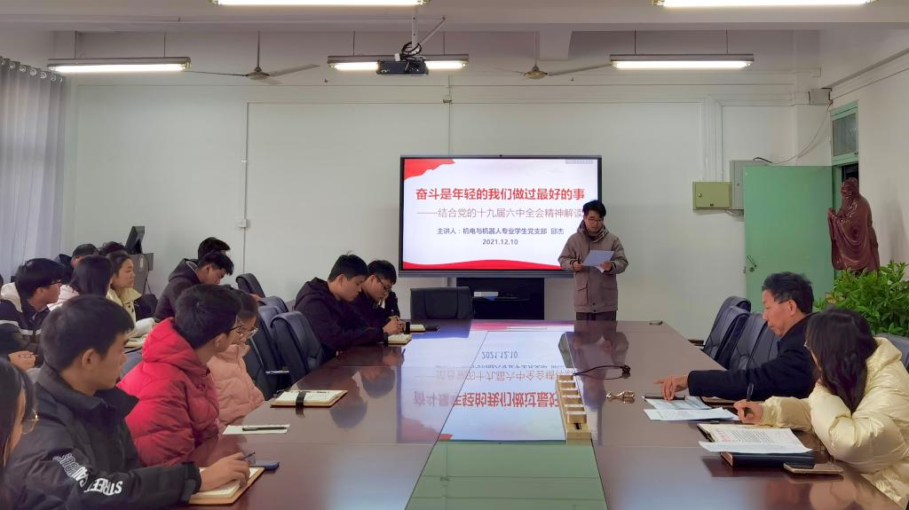根据学校党委和学工部有关深入学习宣传贯彻党的十九届六中全会精神的通知要求,2021年12月10日下午,机械工程学院机电与机器人专业学生党支部在笃行楼409会议室组织开展党的十九届六中全会精神专题党课学习。此次专题党课学习由副处级辅导员、支部书记开金苗主持,支部组织委员邱杰担任宣讲人,支部全体党员参加集体学习交流。