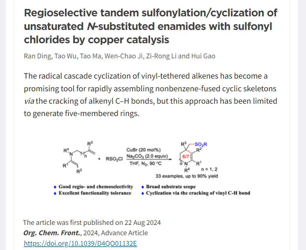 化学与材料工程学院李子荣教授团队在烯胺杂环合上成取得重要进展,相关成果以“Regioselective tandem sulfonylation/cyclization of unsaturated N-substituted enamides with sulfonyl chlorides by copper catalysis”为题发表在中科院一区有机化学权威期刊《Organic Chemistry Frontiers 》。