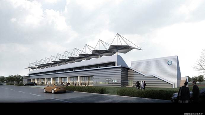 本项目的整体风格简洁大气,深浅两种铝合金格栅与灰色金属坡屋面的搭配相得益彰看台屋顶雨棚采用钢结构悬臂吊挂结构,上覆折板金属屋面,与校园整体风格协调统一。