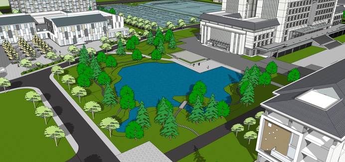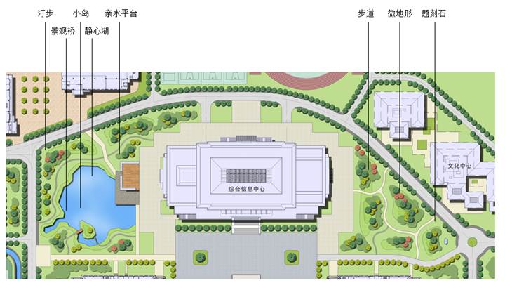 设计上因地制宜,从实际出发,满足消防、集散等功能要求;有重点、分主次打造景观,整体形象清晰,各区特色丰富,生态自然,可持续发展的设计;以绿化景观为主,竖向和水系的整理,进一步丰富景观层次。