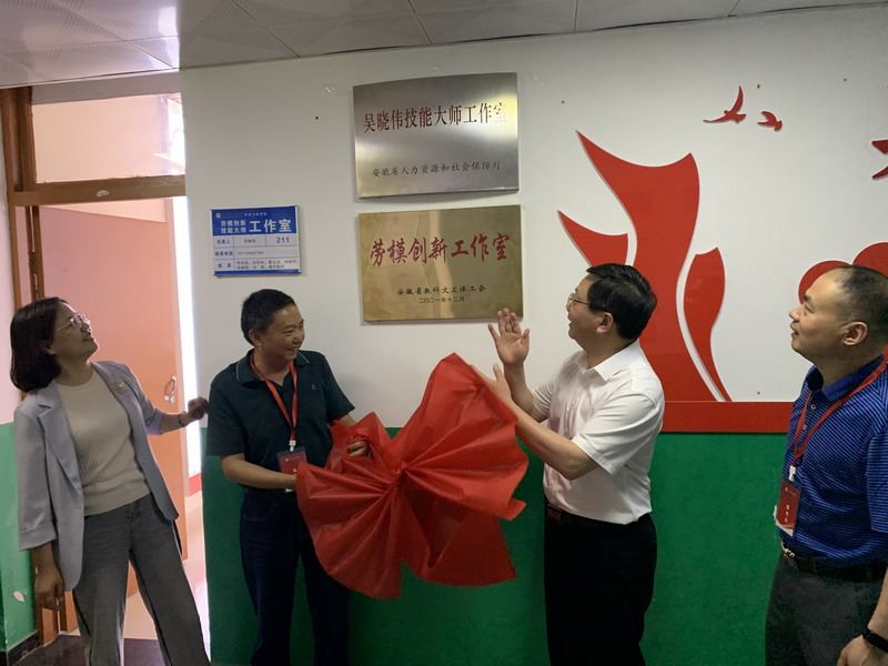 研讨会上,黄远友介绍了我校机械工程学院、食品工程学院在职业技能方面的工作以及毕业学生的需求,特别是吴晓伟老师在技能大赛和创新方面的引领作用。史寅文对吴晓伟老师的模范带动作用进行了肯定,希望再接再厉。戴宗玉对吴晓伟获得省级技能大师工作室表示祝贺,并希望冲刺国家级大师工作室。会后,黄远友、戴宗玉、史寅文、卢伟共同进行了吴晓伟技能大师工作室和劳模创新工作室的揭牌仪式。在隆重热烈的揭牌仪式上,各位领导与同仁共同见证了这一重要时刻,为我校食品工程学院高技能人才培养和技术创新工作开启发展新篇章。