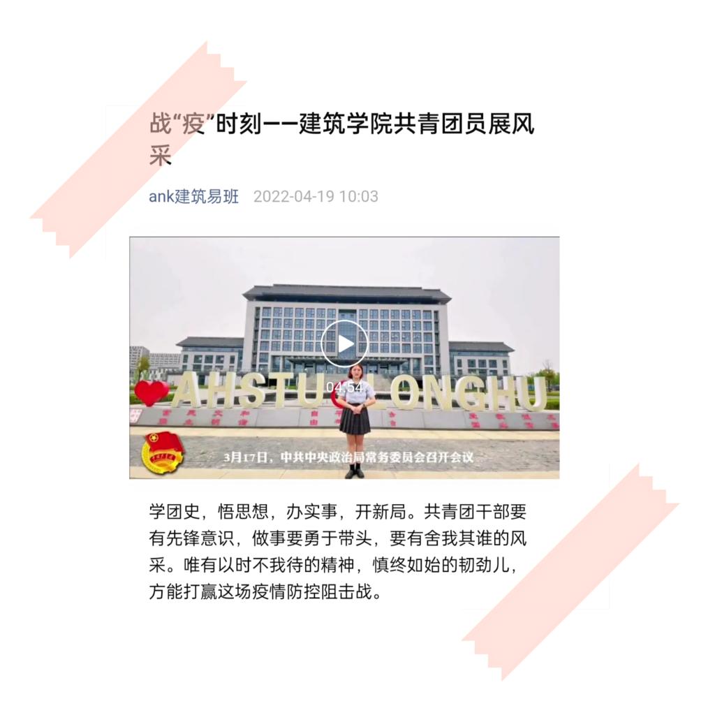 团支部录制的《战“疫”——共青团员的中坚》视频,充分体现了广大团员青年在疫情防控阻击战中贡献青春力量的热情和决心。视频中,张雨欣同学就当下疫情形势进行了系统地讲解,她号召全体共青团员要发挥党的助手和后备军作用,带领班级学生积极作为。罗志娟同学讲述了疫情防控期间建筑学院学子积极参加劳动实践、体育锻炼和文化活动,号召广大青年继续争当表率,以实际行动坚定战胜疫情的决心和勇气。该视频在WG官方网站建筑学院易班微信平台发布后,反响良好,得到师生一致好评。