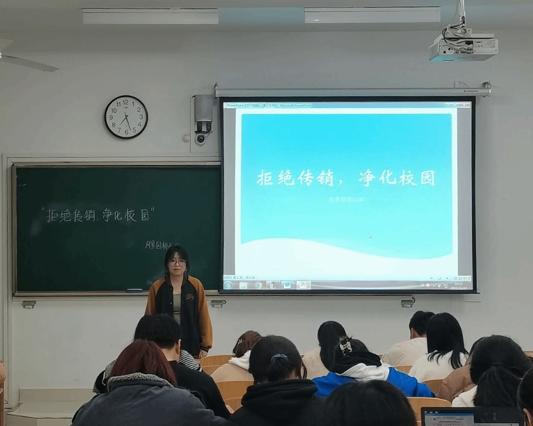 各班级主题班会以PPT解说、播放视频等形式展开,班会内容涵盖学生可能遇到的传销陷阱、怎样防范传销、传销常见手段、传销表现特征等多个方面。各班级主讲耐心向同学们讲解传销的危害以及防范措施,引导学生们加强自我管理,做到识别传销,远离传销。拒绝传销不仅是责任,更是一种使命和担当。同学们纷纷表示通过本次学习,认清了传销违法犯罪活动的欺诈本质及其严重危害,提高了对传销,特别是网络传销的辨识能力,增强了防范意识,在今后的学习生活中将运用科学知识,自觉远离和抵制传销,共筑平安美好校园。