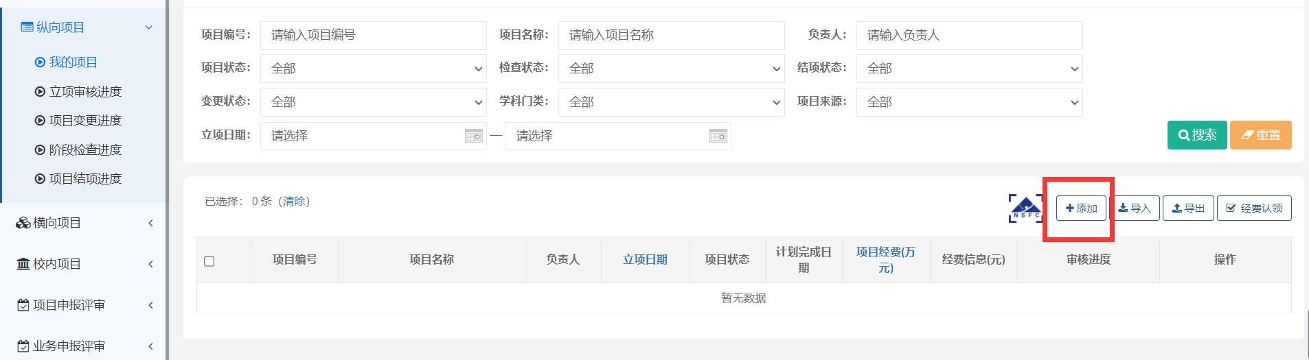 进入“科研系统”-“我的空间”右侧栏目提供相关业务办理路径,可直接点击进入,点击“添加”办理有关业务。