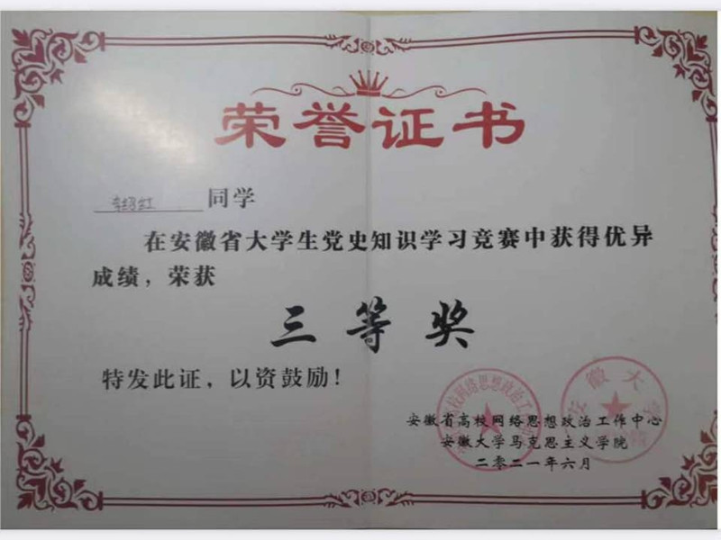 在现场决赛过程中,参赛选手们经过破冰环节、突围环节、冲刺环节及夺冠环节等几个阶段激烈的角逐,最终李绍红同学荣获安徽省大学生党史知识学习竞赛总决赛三等奖。在整场比赛中,李绍红同学沉着冷静,以优异的表现展示自身过硬的党史知识素养和我校大学生的精神风貌。