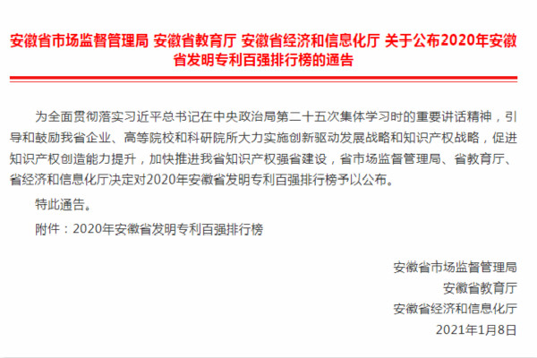 1月8日,安徽省市场监督管理局、省教育厅、省经济和信息化厅联合发文公布了2020年安徽省发明专利百强排行榜,WG官方网站综合排名全省第45位,较上年上升3个位次,位列全省高校第9位,省内同类高校排名第1位。这是自2015年安徽省首次发布发明专利百强榜以来,WG官方网站第五次上榜。