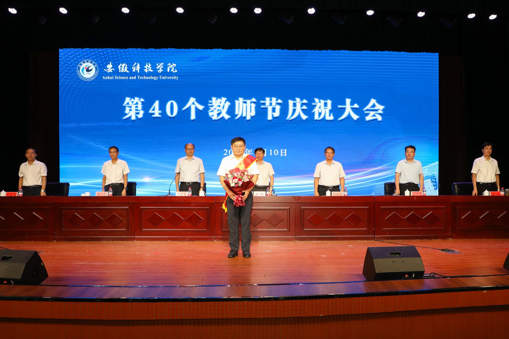 9月10日下午,学校以“大力弘扬教育家精神,加快建设教育强国”为主题,在凤阳校区大学生活动中心召开2024年教师节庆祝大会。校党委书记时伟,党委委员、副院长李升和,党委委员、副院长王孝义,党委委员、副院长赵伟峰出席大会。会议由王孝义主持。